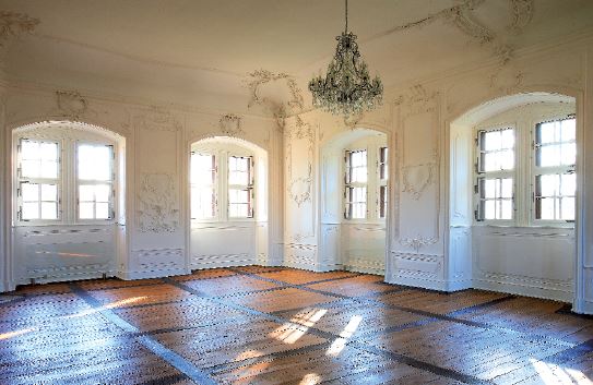 Schloss Leuzendorf reicht in seinem Kern in das 14. Jahrhundert zurück. Damals wurde es erstmalig als Besitz der Herren von Truhendingen erwähnt. Bei dem Schloss handelt es sich um eine nach außen schlichte, quadratische Anlage, die ursprünglich von einem Wassergraben umgeben war. Im 18. Jahrhundert erhielten die großzügigen Zimmer eine prachtvolle, höfische Ausstattung. Seither zieren feinste Rocaille-Stuckaturen mit einer gemalten Ahnengalerie die Decken und Wandflächen des Saals im 2. Obergeschoss.